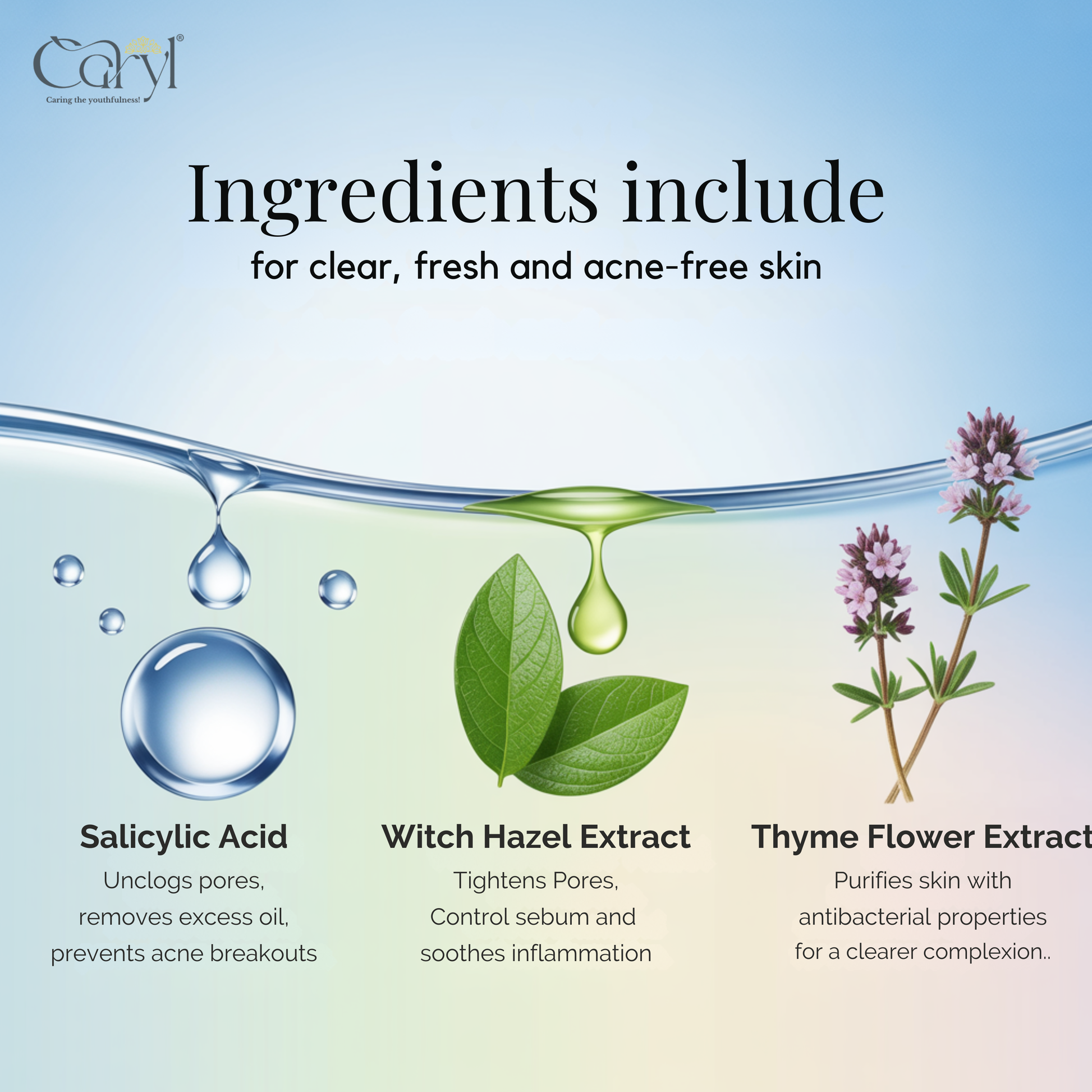 Experience gentle yet effective acne care with CARYL Anti Acne Facial Wipes, enriched with Salicylic Acid, Witch Hazel Extract, and Thyme Flower Extract.