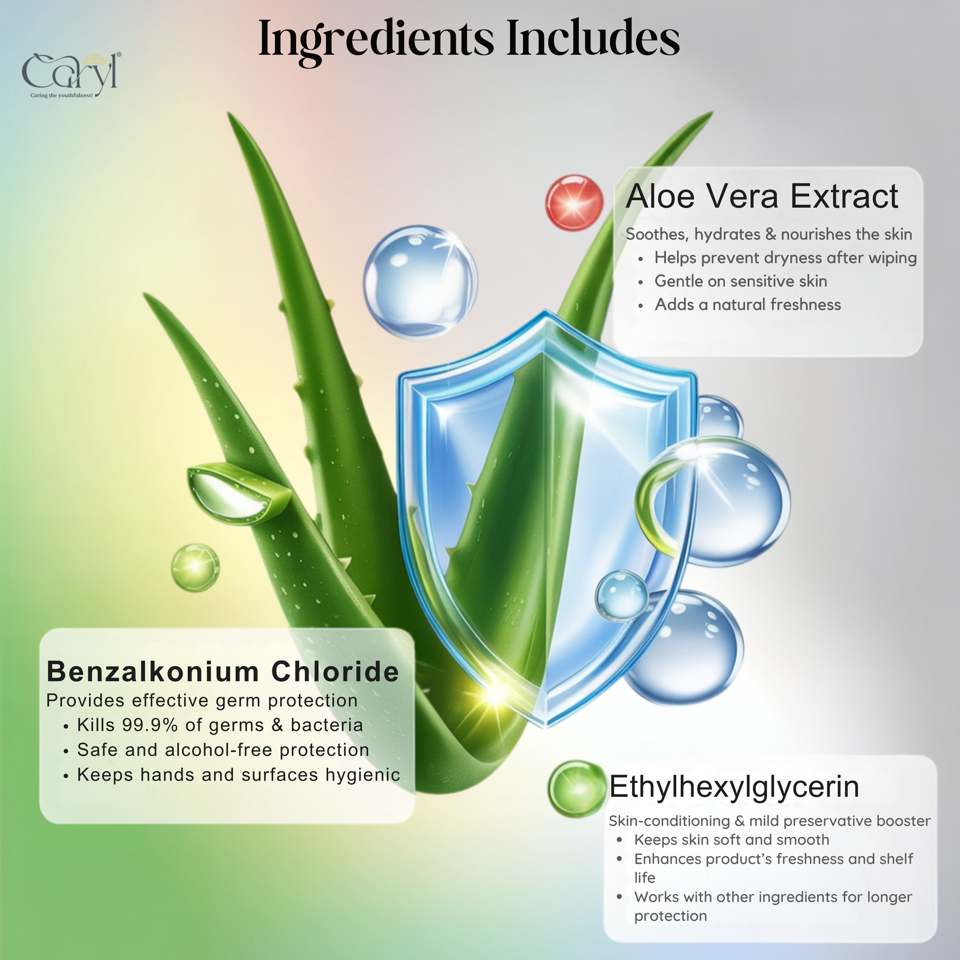 Experience powerful hygiene and all-day protection with CARYL Germ Protection Wipes, formulated for multi-purpose use to keep your hands and everyday surfaces germ-free.